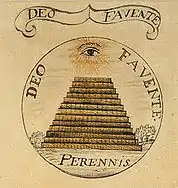 For the reverse, Barton used a pyramid of thirteen steps, with the radiant Eye of Providence overhead, and used the mottos Deo Favente ("With God favoring") and Perennis (Everlasting).[53] The pyramid had come from another Continental currency note designed in 1778 by Hopkinson, this time the $50 note, which had a nearly identical pyramid and the motto Perennis.[53] Barton had at first specified "on the Summit of it a Palm Tree, proper," with the explanation that "The Palm Tree, when burnt down to the very Root, naturally rises fairer than ever," but later crossed it out and replaced it with the Eye of Providence, taken from the first committee's design.[54]