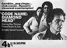 Code Name: Diamond Head is a 1977 American television spy film starring Roy Thinnes[1] as an undercover counterintelligence officer known as Diamond Head whose mission is to stop a rogue double agent from stealing the formula for a new chemical weapon.[2] Originally filmed as a pilot for a new television drama (which was never picked up by the networks), it was eventually used for The NBC Monday Movie on U.S. broadcast network NBC. [3][4]