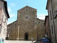 Documents allege a church existed at the site by 756. Of that building, only the baptismal font seems to have survived. The earthquake of 1117 prompted a major reconstruction, and a new building consecrated in 1122. The Portal of Paradise retains some of the Romanesque sculptural elements, with a relief depicting Madonna and Child with St Peter and Angels. The portico on the left of the church with octagonal columns, church cloister, and bell-tower, date to the 15th century. The church facade was also completed in the 15th century. The Palazzo Pretorio adjacent to the church was built in 1293. Further reconstructions and additions occurred in 18th and 19th centuries.