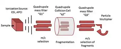 Both, the first mass analyzer and the collision cell are continuously exposed to ions from the source, in a time independent manner.[4] It is once the ions move into the third mass analyzer that time dependence becomes a factor.[4] The first quadrupole mass filter, Q1, is the primary m/z selector after the sample leaves the ionization source. Any ions with mass-to-charge ratios other than the one selected for will not be allowed to infiltrate Q1. The collision cell, denoted as "q", is located between Q1 and Q3, is where fragmentation of the sample occurs in the presence of an inert gas like Ar, He, or N2. A characteristic daughter ion is produced as a result of the collisions of the inert gas with the analyte. Upon exiting the collision cell, the fragmented ions then travel onto the second quadrupole mass filter, Q3, where m/z selection can occur again.