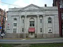Colonial National Bank Building, also known as the Grant Myers Building, is a historic bank building located at Connellsville, Fayette County, Pennsylvania. It was built in 1906, as a one-story, open bank building. It was remodeled during the 1930s, to be two-stories. It has two Classical Revival facades, featuring four, two-story Ionic order columns supporting a pediment on each side.[2]