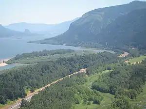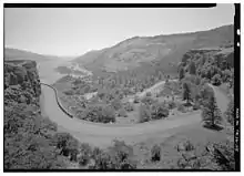 The Columbia River Gorge is the lowest crossing of the Cascade Mountains, carved by the Columbia River during the Cascades' uplift.[5] Rafting down the gorge from The Dalles was one of the most expensive and dangerous parts of the Oregon Trail, traveled by thousands of emigrants to the Oregon Territory, until the Barlow Road opened in 1846 around the south side of Mount Hood.[6] A wagon road was finally built through the gorge in the 1870s, when The Dalles and Sandy Wagon Road was constructed along the south shore from The Dalles to the Sandy River east of Portland. However, this road had steep (20%) grades and a crooked and narrow alignment, and it was not until 1882 that the Oregon Railway and Navigation Company finally opened a water-level route, partially destroying the wagon road. With the onset of the automobile and the good roads movement of the early 20th century, a road was once again needed, and Multnomah County began constructing a 20-foot (6 m) roadway with 9% grades, but ran into difficulties relating to the railroad's location. At Shellrock Mountain to the east, long believed to be an impassable barrier, Governor Oswald West used prison labor in 1912 to prove that it was possible to build a road, at least temporarily.[7]