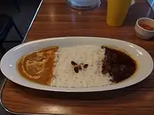 In Costa Rican and Panamanian cuisine, a combination meal is referred to as a casado, which means "married".[9][10] It is a typical lunch dish in both countries.[9][10] In Costa Rica, a casado typically consists of a meat dish, rice and beans, and deli salads.[9] Additional foods comprising the Costa Rican casado can include fried plantain, noodles and tomatoes.[11] In Costa Rica, the term plato del día (plate of the day) is frequently used interchangeably with the term casado.[11]