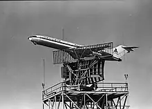 A Mexicana Boeing 727 flying over a radar facility at Los Angeles International Airport in 1986