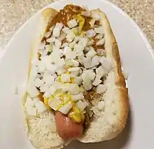 The menu of all Coney Island restaurants centers on the Coney Island hot dog, which is a natural-casing hot dog in a steamed bun dressed with chili, diced onions, and yellow mustard. This item is usually referred to simply as a "coney." Another popular item on most Coney Island restaurant menus is the "loose burger," which consists of crumbled ground beef in a hot dog bun, covered in the same condiments as a Coney Island hot dog. Many Coney Islands also serve "chili fries," which are french fries covered in chili, sometimes with mustard, onions and/or cheese added.