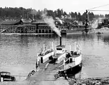 Ferries also operated across the Tualatin River.[1] These included Scholls Ferry at Scholls, operated by Peter Scholl.[11] Scholl settled in the area in 1848, and began operating the ferry in 1850, along what was then the main route between Portland and the upper portions of the Willamette Valley.[12] In the late 1850s, Scholl built a covered toll bridge across the river, but it was washed away in a flood.[12] A more permanent bridge came in 1870, but the crossing became less important when Taylor's Ferry opened downstream.[12] Philip Harris operated a ferry across the Tualatin at Farmington.[13]