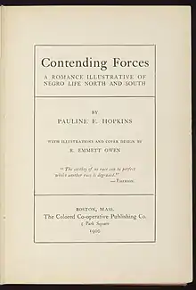 Contending Forces: A Romance Illustrative of Negro Life North and South is the first major novel by Pauline Hopkins, first published in 1900. Contending Forces focuses on African American families in post-Civil War American society. Hopkins, a child of free parents of color, imprinted her "own evasive and unsettling maternal family history, which linked her to the Atlantic slave trade, the West Indies, and the American South"[1] that are described within this text, representing common experiences endured by enslaved and free individuals of this time period.