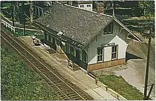 The station, a Stick style wood-frame structure, was built by the Housatonic Railroad in the 1880s to replace an earlier station. The Housatonic was acquired by the New York, New Haven and Hartford Railroad in 1892.[2] The New Haven Railroad was acquired by the Penn Central Railroad in 1969, which went bankrupt by 1970. The station was added to the National Register of Historic Places on April 26, 1972, as Cornwall Bridge Railroad Station.