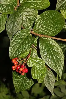 Cotoneaster rehderi, the bullate cotoneaster, is a species of flowering plant in the family Rosaceae.[2] It is native to western Sichuan in China, and has been introduced as a garden escapee to Alaska, British Columbia, Washington state, the British Isles, France, Belgium, and Germany.[1] Found growing in a wide variety of habitats, including sand dunes, it is very similar to hollyberry cotoneaster (Cotoneaster bullatus) but has larger, darker leaves.[2]