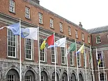 Flags with counties' colours and coats of arms flying in the Upper Yard at Dublin Castle