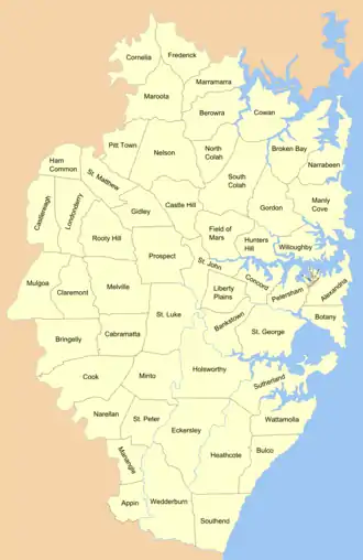 In 1835, Cumberland County was subdivided into 57 parishes.[9] Previously, the subdivisions of the area since the beginning of the colony were called districts. Many of the parishes founded in 1835 kept the name of the district. Others were named after Anglican churches in the same area. This included three of the four small parishes in the Sydney city area: The Parish of St Philip, which is named after St Philip's Church; the Parish of St James, which is named after St James Church, and is still the name of the region today; and finally the Parish of St Andrew which is named after St Andrew's Cathedral. However, the Parish of St Lawrence gave its name to the church, rather than the other way around.[10] Further out of the city, the parishes of St John, St Luke, St Peter and St Matthew, in the Parramatta, Liverpool, Campbelltown and Windsor areas respectively, have Anglican churches which bear the same saints names; St John's in Parramatta (opened 1803); St.Luke's in Liverpool (building began 1818); St.Peter's in Campbelltown (opened 1823, the third oldest Anglican church in Australia); and St. Matthew's in Windsor (consecrated in 1822)