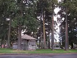 Courthouse Square Park is a town square occupying one city block in downtown Dayton, Oregon. The 1.8 acres (0.73 ha) urban park is listed on the National Register of Historic Places. The park contains the historically significant blockhouse or military fortification that was originally located at Fort Yamhill.[2] In 1911, the structure was moved to Dayton from its original site. The land for the park was donated by Joel Palmer and the park was named 'Courthouse Square' as part of an attempt to make Dayton the government seat of Yamhill County. Although Dayton did not become the county seat and no courthouse was ever constructed, the park's name remained. The Park also contains a picnic shelter, grassy areas shaded by Douglas Firs and native oaks, a basketball court, a playground and public restrooms.[3]