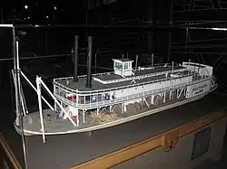 Cow Island was used as a steamboat landing from about the early 1860s to late 1880s. During this approximately 20-year period, freight was transported to the Montana gold fields by Missouri River steamboat.[1] The destination of the steamboats was Fort Benton at the upper limit of steamboat navigation on the Missouri. In mid to late summer river volumes went into seasonal decline. The river became shallower, and heavier draft steamboats could not pass a series of rapids above Cow Island, specifically the Dauphine Rapids, and thus steamboats could not reach the upriver port of Fort Benton. Steamboats had to offload their freight at a downstream landing in the Missouri Breaks. A common landing site in the breaks was at Cow Island, because the offloaded freight could then be taken overland to Fort Benton using a travel route up Cow Creek. Cow Creek was one of the few routes by which freight wagons could get from the river, up through the breaks, to the plains. Using Cow Creek as a travel route, freight could be moved overland from Cow Island landing on the river through the Missouri breaks onto the Montana prairie and on to Fort Benton.