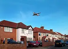 The middle of the locality's position, directly below the flight path of the northern runway of Heathrow Airport led to a ministerial statement-backed undertaking by the airport operator: the Cranford Agreement given on 31 July 1952 at a meeting of the Cranford Residents' and District Amenities Association – as far as possible, the northern runway would not be used for landings or take-offs to the east. This meant that houses under the flight path would not have to suffer the noise from landings, and more especially, louder take-offs.