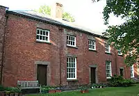 In the 18th century, the site was purchased by John Crewe of Crewe Hall.[2] The Crewe family was by then a major Cheshire landowner with strong ties to Nantwich: Sir Ranulph Crewe, who built Crewe Hall, was born in the town, and his mother came from the Mainwaring family.[6] John Crewe was a prominent Whig politician who served as MP for Stafford (1765–68) and Cheshire (1768–1802), and was created the first Baron Crewe in 1806.[7] He built the existing terrace of almshouses in 1767 "in pursuance of the Wills. of Sir Thomas Crewe Knight & Sir John Crewe Knight", according to the inscription above the main entrance.[2] Sources differ as to whether Crewe demolished the existing building on the site[2] or converted it into the new almshouse.[5][8] The almshouse was for seven families, with "decayed tradesmen" being preferred.[9] In 1883, it was maintained by Hungerford Crewe, third Baron Crewe, the grandson of the founder.[10] The Charity of the Crewe Almshouses was later established, with the Marchioness of Crewe and the agent of the Crewe estate being among the trustees in the 1950s–60s.[8]