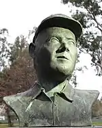 The nearby statue by Valerius[2] (shown below) of Bradman in action was unveiled during the celebrations for "Sir Don"'s 92nd Birthday in August 2000.[3] A minor mystery surrounds the Brian Booth sculpture, similar in style to others by Valerius, but not credited in the official documentation. There is no obvious clue in the plaques, which have remained uniform in style and execution over 30 years.