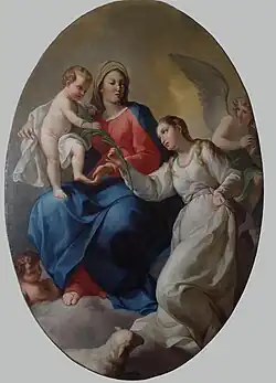 His works were mostly historical, but he also executed genre subjects, landscapes, and fruit and flower-pieces. He painted some genre paintings now in the Liechtenstein Gallery in Vienna. He painted a Madonna with St. John for the Ferdinandeum at Innsbruck; a Martyrdom of St. Pontianus for the cathedral at Spoleto; and an Assumption for the Loreto Cathedral. A number of his works can be seen in the Pinacoteca Civica Fortunato Duranti. He saw the commission for the decoration of a ceiling of the ducal palace of Genoa go to Giandomenico Tiepolo instead of him. He died in Rome.His brother Ignaz Unterberger was a prominent painter who was active in Vienna. One of his pupils was Giuseppe Turchi[3] and Antonio Longo.