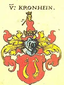 In 1406 they sold their part of the castle Burleswagen near Crailsheim that they were previously buying from Weiprecht of Wolmershausen, to Jörg Lankwarter.[6] A Jakob of Kronheim was married with Anna von Habsberg.[7] A Wilhelm of Cronheim (†1485) was a member of the brotherhood Prämonstratenser-Order St. Marien auf dem Harlunger Berg.[8] That might be seen as an indicator of an allegiance with Frederick I, Elector of Brandenburg. A Hans Georg of Kronheim is mentioned May 11, 1551 as a witness in a shepherd contract between the shepherds in the district of the knights of Absperg.[9]