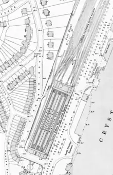 The building was a fine example of High Victorian architecture with high brick side- and end-walls and a glass and iron trainshed roof. It had square towers at each corner, each topped with four short spires, and passenger concourses above the tracks at each end with booking offices, refreshment rooms and waiting rooms. One half of the station was intended for first class passengers, who were given segregated access into the central transept of the palace.