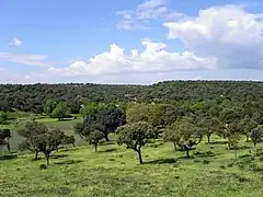 To the south of this mountain range, the terrain descends to the Monte de El Pardo, the third geomorphological unit through which the park runs, covering approximately 16 000 hectares.[8] The granitic materials give way to detrital and sandy elements, the result of the erosion of the Guadarrama and Hoyo mountain ranges, which form an undulating landscape of gentle hills, with an average altitude of 600 m. The Monte de El Pardo sits on an immature soil, easily eroded. Similar characteristics are found in Monte de Viñuelas, eastern appendix of El Pardo.