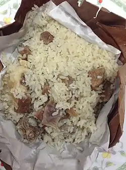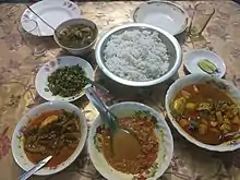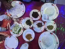 The Chittagong Hill Tracts are home to tribes with their own culture and cuisine.[39][40] Chakma cuisine uses sidol, a paste made from fermented shrimps and fish, and suguni, dried shrimp or fish.[41] Their dishes use more herbs from the hills more than the spices common in Bengali dishes.[41] Important seasonal ingredients include wild mushrooms and the Flowers of ginger and turmeric plants.[41] Sumoh gorang is a dish cooked in bamboo and Hebaang is baked in banana leaves in a mud oven.[41] Marma cuisine uses a paste of dried fish called nappi.[4] Rice beer is a popular drink.[4]