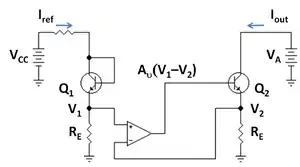 Figure 3 shows a mirror using negative feedback to increase output resistance. Because of the op amp, these circuits are sometimes called gain-boosted current mirrors. Because they have relatively low compliance voltages, they also are called wide-swing current mirrors. A variety of circuits based upon this idea are in use,[6][7][8] particularly for MOSFET mirrors because MOSFETs have rather low intrinsic output resistance values. A MOSFET version of Figure 3 is shown in Figure 4, where MOSFETs M3 and M4 operate in ohmic mode to play the same role as emitter resistors RE in Figure 3, and MOSFETs M1 and M2 operate in active mode in the same roles as mirror transistors Q1 and Q2 in Figure 3. An explanation follows of how the circuit in Figure 3 works.