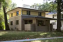 The Curtis Yelland House is a historic building located in Mason City, Iowa, United States. Frank Lloyd Wright associate William Drummond designed this Prairie School style house, completed in 1910.[2] The house features a strong horizontal emphasis, broad hip roofs, board-and-batten siding, stucco on the upper-story, and a centrally located fireplace and chimney round which the open plan interior revolves. The main entry is on the side of the house. The only entry to the front porch is from the living room.[2] It was listed on the National Register of Historic Places in 1980.[1] The house suffered a devastating fire in 2008, and was almost torn down. However, developer Jeff Tierney bought the property and restored the house in 2010.[3]