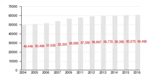 According to the Central Statistical Office data, the district's area is 46.19 square kilometres (17.83 square miles) and 59 395 people inhabit Dębniki.[1]
