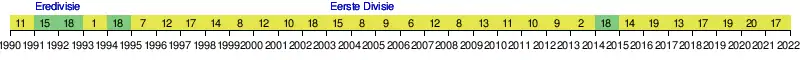 On 18 May 2014, Dordrecht won promotion to the Eredivisie for the first time in 19 years, after a 3–1 win over Sparta Rotterdam in the second leg of the promotion play-off finals, after the first leg had ended in a 2–2 draw.[8] Shortly afterwards, head coach Harry van den Ham announces that he would leave the club to join FC Utrecht's managing staff. In the Eredivisie, Dordrecht won their first match against SC Heerenveen, but suffered relegation in the last matchday after Go Ahead Eagles won the away match against Feyenoord.[9] Chairman Ad Heijsman stepped down at the end of March 2015, and supermarket manager Cees van der Poel took over.[10] After relegation of 2015, almost all regular starters had left. An almost completely new team was brought in, including talented players from other Dutch clubs such as Alvin Daniels, Jeroen Lumu and Jafar Arias, but experience was also gained in the form of Geert Arend Roorda.[11]