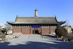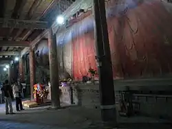 The hall which contains the Buddha is 48 metres (157 ft) long and 24 metres (79 ft) wide, with a height of 33 metres (108 ft). It has a Qing dynasty (1644–1911) mural and is one of the few wooden structures of its period which survive.[7] The mural tells the story of Xuanzang and his followers, showing Xuanzang riding on a horse and the monkey king Sun Wukong kneeling on the ground.[8][6]