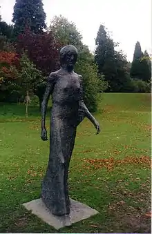 The Second World War, which broke out shortly before Frink's ninth birthday, provided context for some of her earliest artistic works.[5] Growing up near a military airfield in Suffolk, she heard bombers returning from their missions and on one occasion was forced to hide under a hedge to avoid the machine gun attack of a German fighter plane.[6] Her early drawings, from the period before she attended arts school in London, have a powerful apocalyptic flavour: themes include wounded birds and falling men.[4] During the course of the war Frink was evacuated with her mother and brother Tim to Exmouth, Devon where she attended Southlands Church of England School. When Southlands School was commandeered for the war effort in 1943 Frink became a full time pupil at The Convent of the Holy Family School.[7]