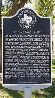 - ↑ Pi3.124 (October 8, 2017), English: Texas historical marker for the Ku Klux Klan trials, retrieved July 29, 2020