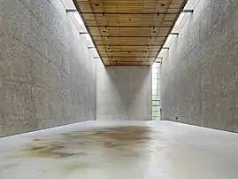 Daniel Turner studied painting and printmaking at Norfolk State University and received a B.F.A. from San Francisco Art Institute.[1] Turner worked in construction and demolition before being employed as a security guard at The New Museum in New York City.[2] He was hospitalized several times for psychosis resulting in an action titled, Burning an Entire Body of Work (2006)[3][4] in which he burned all previous paintings to date.[5] Turner now works primarily in sculpture often involving the creation or transformation of materials, objects and environments into architectural or ephemeral forms. His sculptures are often characterized by a specific response to site[6] under a controlled set of processes. This approach has enabled Turner to base form on transposition, preserving a sensory link to geographical locations, cultural associations and human contact. These elements are present in works where an entire waiting room is cast into a series of solid bars,[7] a former psychiatric facility burnished to a darkened stain against a wall,[8] or a cafeteria dissolved[9] across the expanse of a floor.[10] In 2019, Turner extracted one metric ton of hospital beds from The Vinnitsa Regional Psychoneurological Hospital in Vinnitsa Ukraine which were archived, melted and recast into two solid forms. Archived 2022-03-04 at the Wayback Machine. For his solo exhibition at Kunsthalle Basel (2022), the artist extracted elements from three sites in the Basel region that triangulate between architecture, the pharmaceutical industry, and psychology.[11] These materials included several tons of heating radiators and oil tanks which the artist removed from the interiors of the chemical plant BASF, the pharmaceutical labs of Novartis, and former psychiatric facility Holdenweild.[12] Material excavated from each of the three sites were melted into minimal forms and burnished into the surface of large scale works on canvas.[13] [14][15]