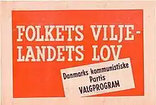 The DKP continued to operate underground, and was a major force in the Danish resistance movement.[1][5] Members of the DKP sat on the Danish Freedom Council, the largest underground resistance force against the German occupation.[1] Following the collapse of the national unity government on 29 August 1943, the DKP, along with other non-socialist resistance forces, became the informal government of the country.[5][7]