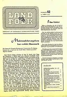 During the German occupation of Denmark, the party began publishing a clandestine newspaper called Politiske Maanedsbreve ("Political Monthly Letters"), which was soon renamed Land og Folk ("Land and People").[5] It was one of the most widely circulated underground papers in the country,[5] and continued as the main press organ of the DKP until 1982. In addition, the DKP published a large number of local papers.[5]