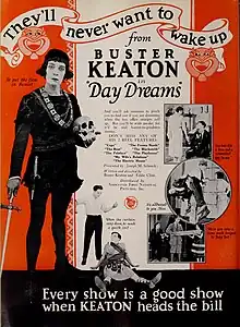 Day Dreams (also billed as Daydreams) is a 1922 American short comedy film directed by and featuring Buster Keaton.[3] It is most famous for a scene where Keaton finds himself on the inside of a riverboat paddle wheel. It is a partially lost film[4] and available from public domain sources.[5]