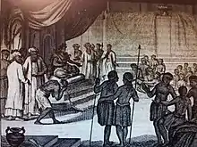 Now Dayal's half-brother Tabariji was enthroned. His mother was another Tidore princess, the well-known Nyaicili Boki Raja. Pati Sarangi married her and became the new regent, though he was soon deposed due to treason. Meanwhile, Dayal was active in fomenting a new alliance with the rulers Mir of Tidore, Alauddin of Bacan and Katarabumi of Jailolo, in order to regain his throne. The new Ternatan regent Samarau also sympathized with the alliance. Things looked very somber for the Portuguese who were cornered in their fortress.[7] At this moment, in October 1536, a relief armada appeared from Melaka with a new captain, António Galvão. The capable Galvão, accompanied by 170 Portuguese and 120 dependents led an attack on the fortification of the four allies in Tidore. The allies were well equipped with 5-600 firearms, cuirasses, coats of mail, helmets and swords which had been taken from the Portuguese or received from the Spaniards.[8] In spite of this the invasion turned very successful, and the defenders were pushed back on 21 December. Dayal fought valiantly in shining armour and a headdress with bird-of-paradise feathers, but was severely wounded and died soon after.[9] The allied kings had to agree on peace with the Portuguese.[10] About Dayal's violent end, "they always kept this very secret since he was the first king of Maluku to die by the sword, and they consider this a great dishonour and disgrace because in these countries custom does not permit them to wound a king, and still less to kill him. They keep this as a law because they hold the king to be a holy and sacred thing; and those who survive must revenge his death".[11]