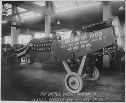 The Dayton-Wright Company was formed in 1917, on the declaration of war between the United States and Germany,[1] by a group of Ohio investors that included Charles F. Kettering and Edward A. Deeds of Dayton Engineering Laboratories Company (DELCO). Orville Wright lent his name and served as a consultant, but other than that, the location of one of its three factories in the original Wright Company factory buildings in Dayton, Ohio was the only connection to the Wright brothers. In addition to plant 3 (the former Wright Company buildings), Dayton-Wright operated factories in Moraine (plant 1, the main factory) and Miamisburg (plant 2), Ohio.[2] During the course of the war, Dayton-Wright produced about 3,000 DH-4s, as well as 400 Standard SJ-1 trainers. The company was hurt by the reputation of the DH-4s it produced as "flaming coffins" or "flying coffins", although they were not in reality more subject to catching fire than other aircraft,[3] and by scandals it faced.
