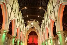Construction of a transitional cathedral started on 24 July 2012.[72] The site, on the corner of Hereford and Madras Streets, several blocks from the permanent location, was blessed in April 2012.[73] Designed by architect Shigeru Ban and seating around 700 people, it was expected to be completed by Christmas 2012, but the completion date was put back to July and then August 2013 with the dedication service held on 15 August. The materials used in its construction include cardboard tubes, timber and steel.[74]