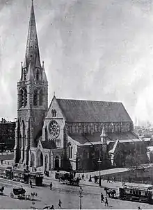 The nave, 100 foot (30 m) long, and tower were consecrated on 1 November 1881.[16] When Mountfort died in 1898, his son, Cyril Mountfort (1852–1920), took over as supervising architect and oversaw the completion of the chancel, transepts and apse, all of which were finished by 1904. The Christchurch Beautifying Society planted two plane trees to the south in 1898.[16]