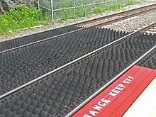 In the mid-2010s, the Federal Railroad Administration (FRA) did a pilot study on anti-trespass panels, a British innovation consisting of spiky rubber mats designed to be difficult to walk on, placed on one side of a grade crossing in an area of Fayetteville, Arkansas, popular with pedestrians. It found the panels reduced trespassing overall in the area by 38 percent over several months.[15] They have since been installed at some locations, such as the redesigned Breakneck Ridge station on Metro-North's Hudson Line in New York.[16]