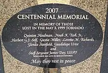 A memorial stands along a walking and bike path on Sooner Road and is dedicated to the seven people who lost their lives during the May 3 tornado.[31] United States Air Force Staff Sergeant James Day was killed in an ATV accident on May 8, 1999, while he was patrolling an area of Tinker AFB, Oklahoma, which had been damaged in the tornado. He is also listed on the memorial.[32]