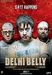 Delhi Belly is a 2011 Indian crime comedy film[3][4] written by Akshat Verma and directed by Abhinay Deo. It stars Imran Khan, Kunaal Roy Kapur, Vir Das, Poorna Jagannathan and Shenaz Treasurywala. It is a Hinglish-language film, with seventy percent of the dialogue in English and thirty percent in Hindi.[5] The film is produced by Aamir Khan Productions and UTV Motion Pictures. The theatrical trailer of the film premiered with Aamir Khan's Dhobi Ghat on 21 January 2011 while the film was released on 1 July 2011, along with a Hindi dubbed version.[6][7][8] The film was given an 'A' certificate for its profanity, intense violence and sexual content.[7] The film was remade in Tamil as Settai.[9]