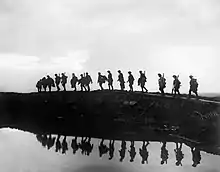 The 1st Division's artillery was in action from the start of the Third Battle of Ypres on 31 July 1917 but the infantry were not called upon until the second phase of the battle commenced on 20 September with the Battle of Menin Road. Attacking across 1,000-metre (1,100 yd) front, along with ten other divisions, including the Australian 2nd Division on their left, the 1st Division captured around 1,500 metres (1,600 yd) of ground, securing Glencorse Wood and gaining a foothold in Polygon Wood.[39] The Australian divisions suffered 5,000 casualties from the battle – the 1st Division lost 2,754 men[32] – mainly due to retaliatory shelling from heavy artillery after the advance had completed.[40]