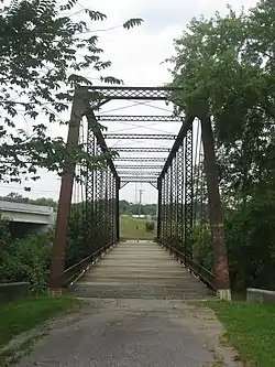 In 1835, an early toll bridge across the Tiffin was built at the nearby community of Brunersburg, but it was soon destroyed by a flood.[2] The current bridge is a Pratt through truss bridge that was manufactured by the Massillon Bridge Company and built in 1906.[1] Built on concrete supports,[3] it is constructed primarily of iron. In 1907, it became a local landmark for surveying purposes when a USGS surveyor placed a benchmark on its northwestern abutment.[4]