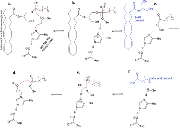 Initially, histidine deprotonates serine forming a strong nucleophilic alkoxide, which attacks the carbonyl of the acyl group at the sn-1 position of DAG.[1] A tetrahedral intermediate briefly forms before the instability of the oxyanion collapses the tetrahedral intermediate to re-form the double bond while cleaving the ester bond.[11] The monoacylglycerol product, which in this case is 2-arachidonoylglycerol, is released leaving behind an acyl-enzyme intermediate.[11]