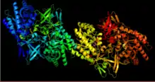While the majority of DAPDC found in various species of bacteria have the same basic components, not all species follow the same structure.[3] Some species of bacteria, such as Mycobacterium tuberculosis have been observed as a tetramer.[6] The tetramer is shaped like a ring with the active sites accessible from the inside of the enzyme.[6]