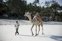 The beach is about 17 kilometres (11 mi) long, from the Kongo river to the north and Galu beach to the south (the southern point of reference is an old Baobab tree). Diani is one of the most prominent tourism resort areas of Kenya. The indigenous people of the area are the Digo, one of the nine ethnic communities known as the Mijikenda. Today the area includes Kenyans of various ethnicities who have migrated to Diani, drawn by the tourism related economy.[1] With a population of over 100,000 inhabitants, the Diani/Ukunda urban area is one of the largest at the Kenyan coast and forms part of the larger Mombasa metropolitan region. A small airstrip - Ukunda Airport - is located between the beach area and the Mombasa-Lunga Lunga road. The water remains shallow near shore, with some underwater sandbars near the surface which allow wading with a clear view of the sandy bottom. Inland from the beach, there is extensive vegetation (see photo at right), including numerous palm trees which cover the coastal areas, unlike the dry acacia trees of the mountainous Kenyan Highlands. The Mwachema River flows into the sea at Diani Beach.[2]