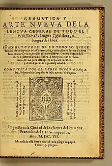 González Holguín was born in the Extremadura region of western Spain in 1560. He arrived in Peru as a missionary in 1581. He undertook a study of Quechua, and in 1607 published a grammar that documented "Classical Quechua", a dialect of Southern Quechua that was spoken in the contemporary Incan court.[2] The complete title of the work is Gramatica y arte nueva dela lengva general de todo el Perv, llamada lengva Quichva, o Lengva del Inca).