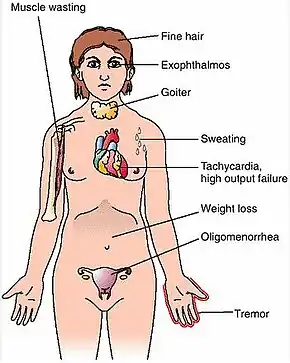 Graves' disease, also known as toxic diffuse goiter, is an autoimmune disease that affects the thyroid.[1] It frequently results in and is the most common cause of hyperthyroidism.[5] It also often results in an enlarged thyroid.[1] Signs and symptoms of hyperthyroidism may include irritability, muscle weakness, sleeping problems, a fast heartbeat, poor tolerance of heat, diarrhea and unintentional weight loss.[1] Other symptoms may include thickening of the skin on the shins, known as pretibial myxedema, and eye bulging, a condition caused by Graves' ophthalmopathy.[1] About 25 to 30% of people with the condition develop eye problems.[1][4]